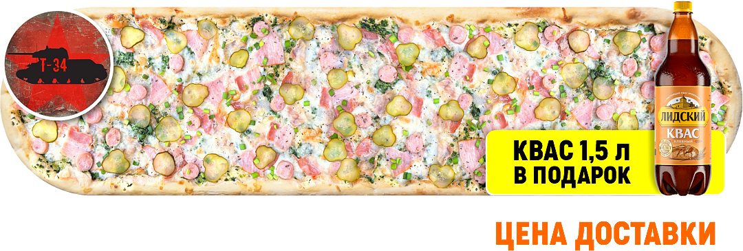 *цена доставки. Лидский квас 1,5 л в подарок. Сыр Моцарелла, шампиньоны свежие, ветчина куриная, огурец маринованный, кетчуп, соус Горчичный, лук фри, зелень укропа. Аллергены: 3, 5, 9, 14. Калорийность: 235 кКал
