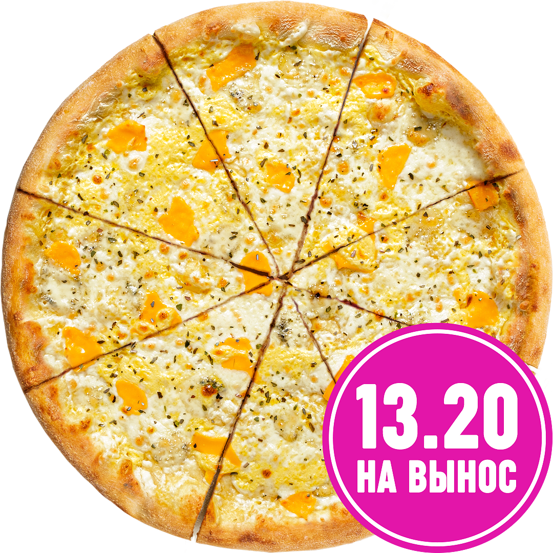 Сыр моцарелла, сыр дор-блю, сыр Грана Падано, сыр чеддер, сыр буффало, томатный соус, чесночное масло, орегано. Аллергены: 5, 9,14. Калорийность: 298 кКал