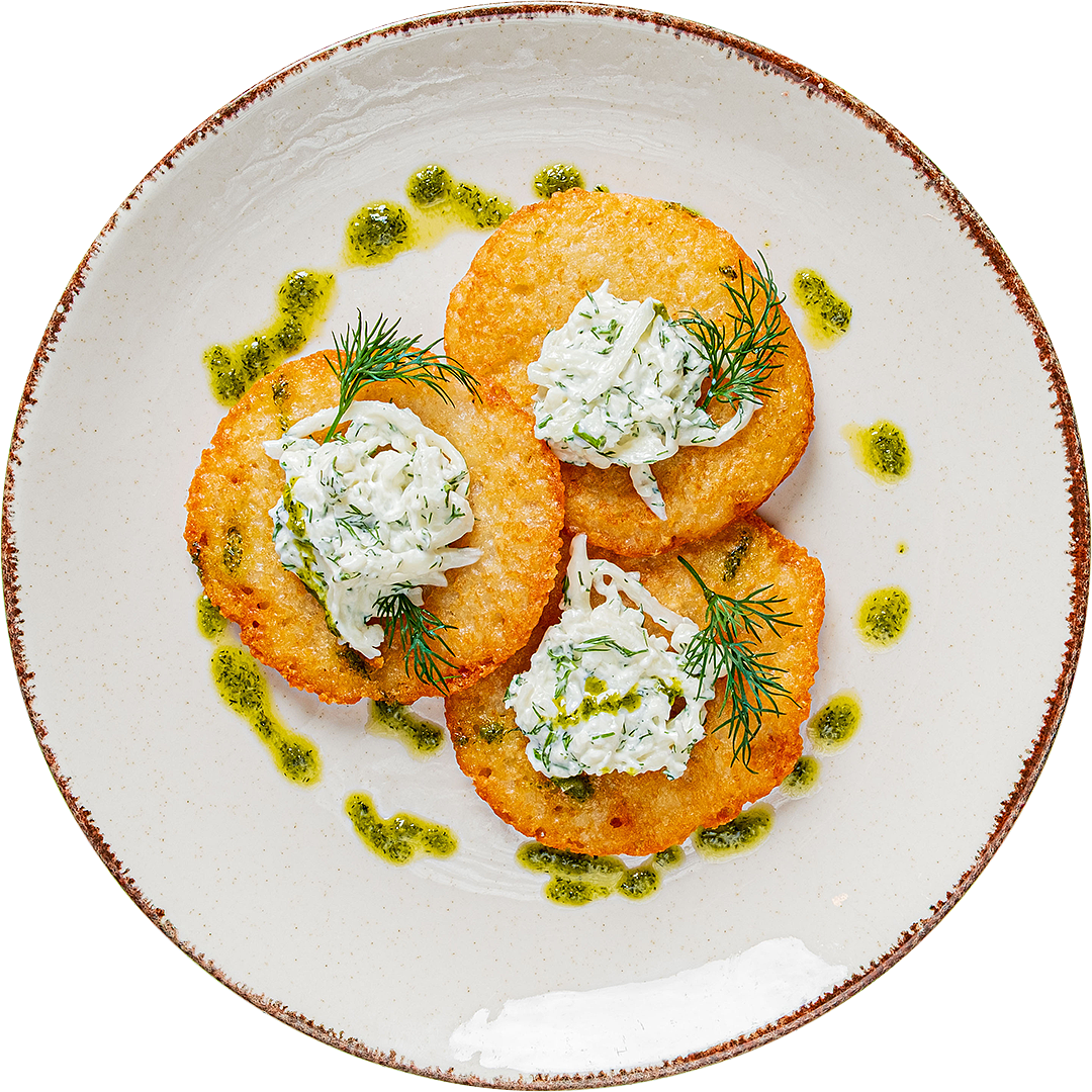 Картофельные драники, сыр, майонез, чеснок, зелень