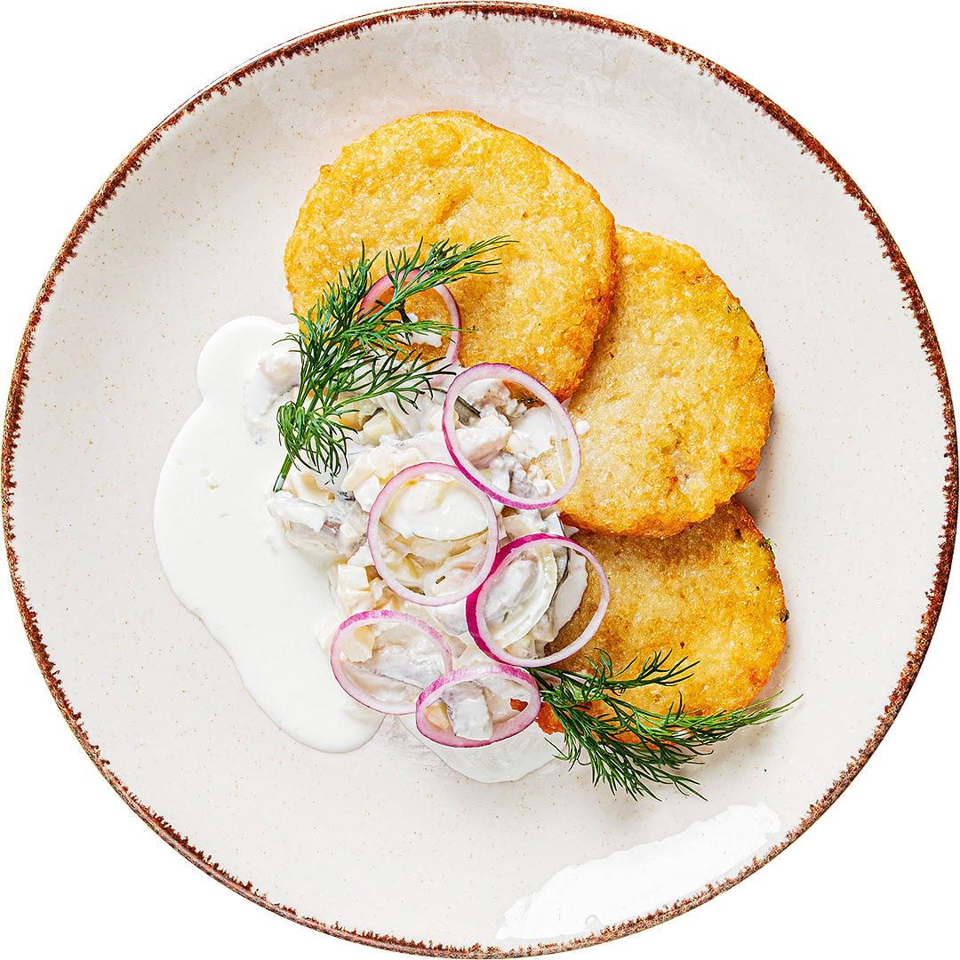 Картофельные драники, филе сельди со сметанным соусом и кусочками яблока, маринованного огурца и лука