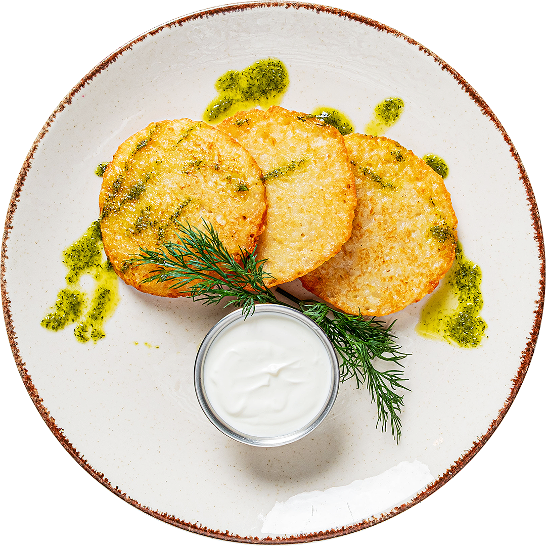 Картофельные драники с соусом из лесных грибов. Аллергены: 9. Калорийность: 152 кКал