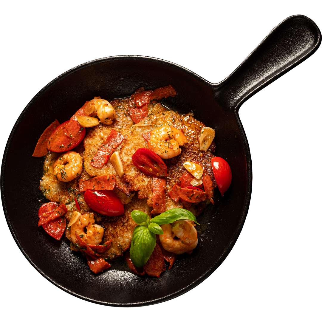 Картофельные драники с креветками в пикантном остром соусе с томатами, итальянскими колбасками, перцем чили и зеленью