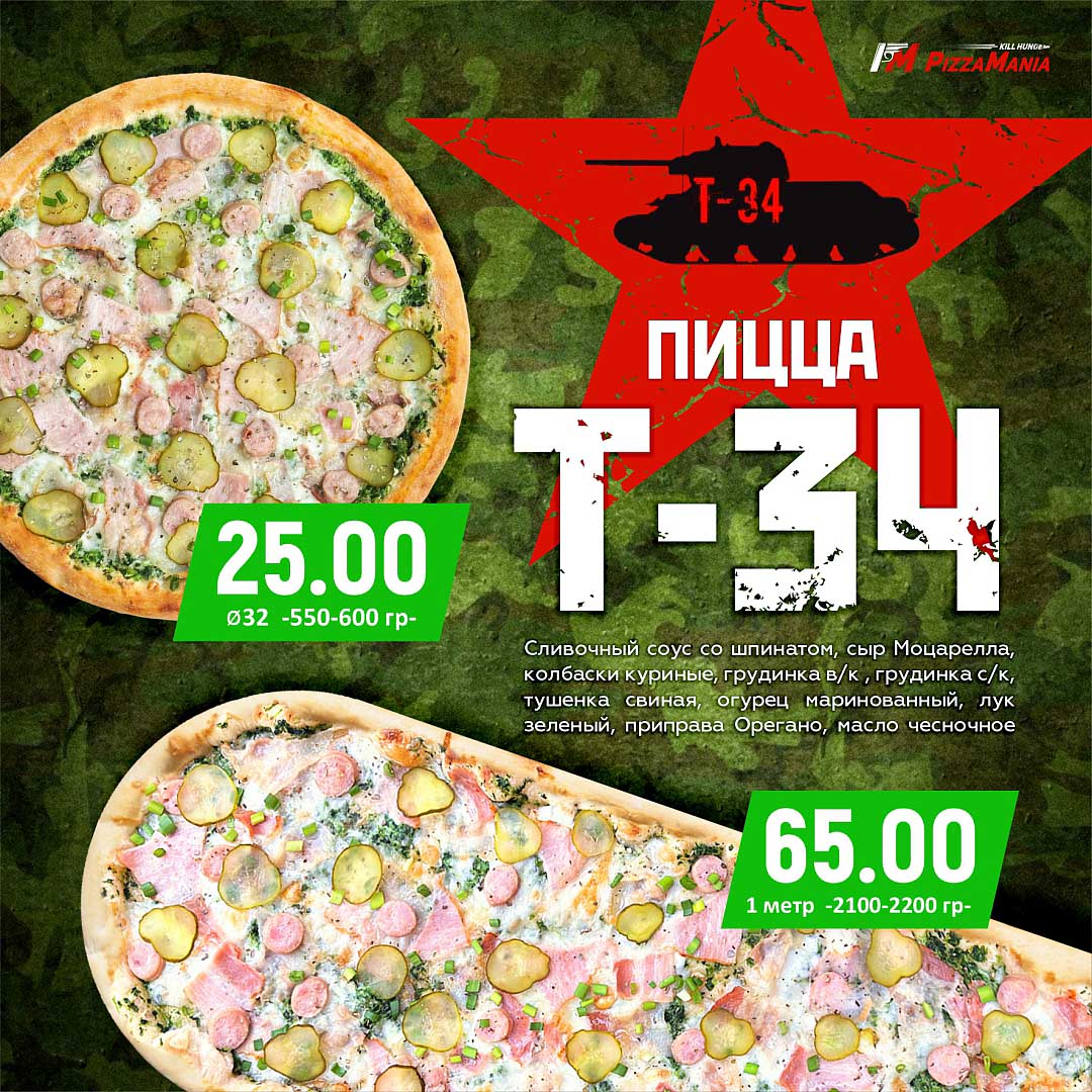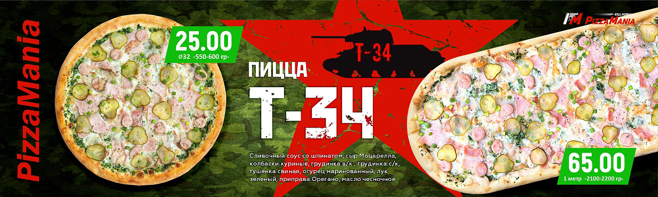Пицца Пепперони 32см, пицца Мясная 32см, пицца Деревенская 32см.